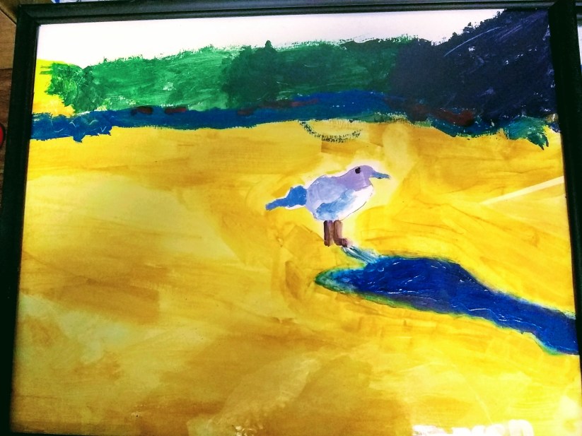The fourth and final Sabbath, we painted the hills in the background. These are a couple examples of our “Seagull on Seashore” in acrylic paint after my art instructor, Chris DiDomizio, who is currently painting a portrait series of President Jimmy Carter here in Plains, GA. Hold onto this framed art piece!
