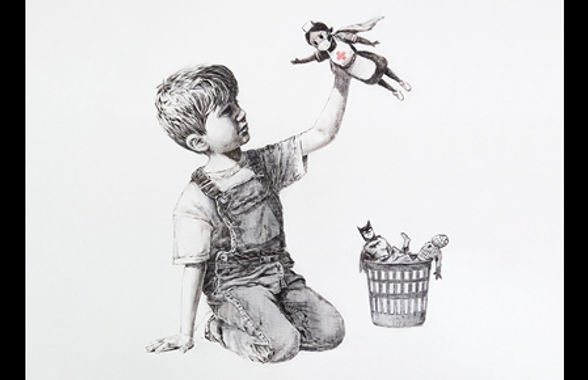 The black and white work of the famous British street artist depicts a boy on his knees, brandishing a superhero doll, a nurse in a cape, mask and apron decorated with a red cross, the only touch of color. In a basket near the boy, we see Batman and Spiderman careless.