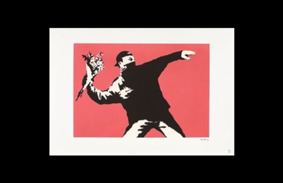 Rendered in Banksy’s characteristic signature stencilled style, Love Is In The Air, depicts a young man, dressed as a militant, wearing a baseball cap and a bandana to mask the lower half of his face, in the middle of throwing a grenade or molotov cocktail.