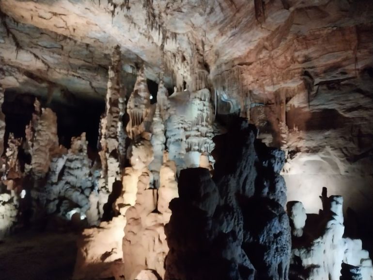 Entering Cathedral Caverns was like landing on a different planet. I’m clostrrphobic, but I felt secure venturing through the huge portal, measuring 126 feet wide and 25 feet high. Jay Gurley measured the height of the ceilings throughout the caverns by tying a tape measure to a helium baloon. He measured 80ft. He was only one foot off from today’s measurements. I’m guessing that he forgot to measure the balloon.